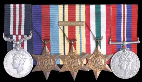 GROUP OF FIVE TO LANCE NAIK BAHADUR KHAN, Royal Indian Army Service Corps Military Medal (GVIR) (TC-62649 DVR Bahadur RIASC); 1939-45 Star; Africa Star (8th Army); Italy Star; British War Medal 1939-45. Military Medal only named, impressed, others unnamed. Very fine.
