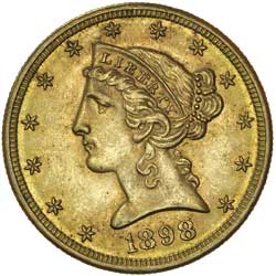 U.S.A., five dollars or half eagle, 1898S, Liberty head. Good extremely fine.