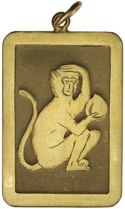 GOLD MONKEY PENDANT, (22ct, 38.3gms, 47mm x 33mm), features central monkey right holding a coconut, all on a flat finish background and with a raised border, the design and border with polished finish. Good very fine.