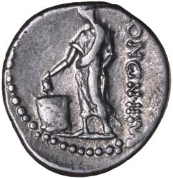 L. CASSIUS LONGINUS, (63 B.C.), silver denarius, Rome mint, (3.90 grams), obv. Vesta veiled draped head to left, kylix behind, L before, rev. male standing left, dropping tablet inscribed [V], into a cista, [L]ONGIN III V behind, (S.364 [œ185 EF], Cr.413/1, Syd.935, RSC Cassia 10). Bright, good very fine and very scarce.