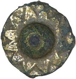 GREEK, gilt bronze clip on miniture Macedonian shield for either dress or military garb, with gilt radiating rays from central globular projection, (4th - 3rd century B.C.). With old patination very fine, rare.