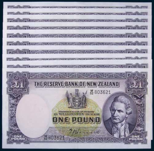RESERVE BANK, T.P. Hanna (1940-55), one pound, letter over date, M/52 803621/30 consecutive run of ten notes (Robb.R.222b; L.612; P.159a). Light centre fold, nearly uncirculated and rare as a run. (10)