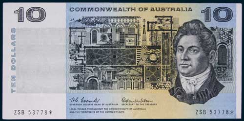 TEN DOLLARS, Coombs/Wilson (1966) ZSA 01856* and ZSA 71495* (R.301s). A tiny 1mm tear centre ...