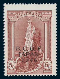 AUSTRALIA, BCOF a study collection from,1/2d to 5/-, includes block of 4 1/2d with wrong font variety 6 (SG11a £100 ullustrated), and other varieties in blocks of 4 x 2 and a pair; 3d three blocks, a block of 9 and a two blocks of 4; 6d block of 4, 1/- a block of 4 and single, 2/- (illustrated) and 5/- (2, one with edge selvege, both varieties both illustrated). Mostly MUH, a few lower denominations with a single hinge of blocks of 4. (43)