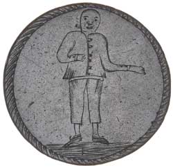 CONVICT LOVE TOKEN, engraved on shaved down halfpenny, with engraved milling around edge, obverse, engraved 'John / Porter and / Ann wilkinson', below engraved two overlaid hearts pierced by arrows, reverse, engraved full length image of young man facing. Some scratches on obverse, otherwise good very fine.