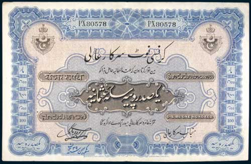 HYDERABAD, one hundred rupees, signature Hyder Nawaz Jung, (FE1339/1929-30) different month, PZ 02404 (P.S266b; Jhun.10.3). ...