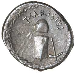 T. CARISIUS, (46 B.C.), silver denarius, Rome mint, (4.21 grams), obv. head of Juno Moneta to right, MONETA behind, rev. cap of Vulcan over anvil between tongs and hammer, T. CARISIVS above, (S.447, Cr.464/2, Syd.982, B. Carisia 1). Lightly toned, nearly very fine and very scarce.