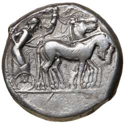 SICILY, Syracuse, (c.485-478 B.C. revised date 467-461), silver tetradrachm, (17.05 gm), obv. fast walking quadriga driven to right by bearded male charioteer, Nike flying right crowning horses, rev. **SUPAKO SION* around to right, head of Artemis-Arethusa to right, hair slightly waved and turned up behind under diadem of beads, four dolphins around, (cf.S.914, Boehringer 93 same dies (obverse 45/reverse 62 dies), Hunter 9). Lightly toned, very fine/nearly very fine and very rare.