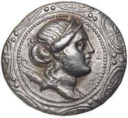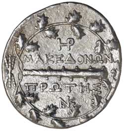 MACEDON UNDER ROMANS, Amphipolis (158-149 B.C.), silver tetradrachm, (17.00 gm), obv. Macedonian shield, at centre of which is a bust of Artemis Tauropolos to right with bow and quiver at her shoulder, rev. **MAKEDONWN PRWTHS* in two lines, club between, HP monogram above, ANK monogram below, all within oak wreath, to left of which a thunderbolt, (S.1386, AMNG 165 [p.55 4 only noted], Hunter 3 [p.179], Mion. Vol.I, No.58 [p.456]). Very fine or better and a very rare variety.