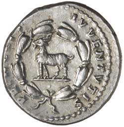 DOMITIAN, as Caesar under Titus, (A.D. 81-96), silver denarius, Rome mint, issued A.D. 80, (3.52 gm), obv. laureate head of Domitian to right, around CAESAR DIVI F DOMITIANVS COS VII, rev. goat standing to left within a laurel wreath, PRINCEPS IVVENTVTIS around, (S.2675, RIC T88, RSC 390). Slightly off centred on reverse, otherwise nearly extremely fine and rare in this condition.