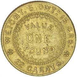 ADELAIDE POUND, 1852, second type with crenellated inner circle on the reverse. Later die state with five notch dots above in carats, nearly very fine.