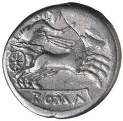 ANONYMOUS SERIES, (157-156 B.C.), silver denarius, Rome mint, (3.71 gm), obv. Roma helmeted head right, X behind, rev. Victory in biga to right, ROMA in exergue, (S.76, Cr.197/1a, Syd.376). Bright, very fine.