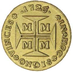 BRAZIL, John V, twenty thousand reis, 1725 (KM.117). Nearly extremely fine and rare.