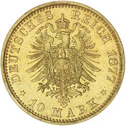 GERMANY, Hamburg, ten mark, 1877J (KM.288). Has been mounted, otherwise nearly extremely fine.
