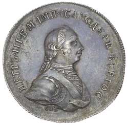RUSSIA, Peter III, silver Novodel rouble, St Petersburg mint, 1762, (23.28 g), obv. cuirassed bust of Peter III right, rev. cruciform surmounted by crowns, monograms in angles, (Sev 1889, Diakov 14, Uzd 0929). Extremely fine with superb cabinet patina, very rare.