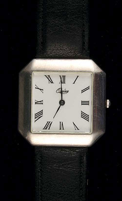 GENT'S WRISTWATCH, Quinn, sterling silver case with screwback, Quinn leather band, white dial with black Roman numerals and black hands. Working condition unknown, very fine.