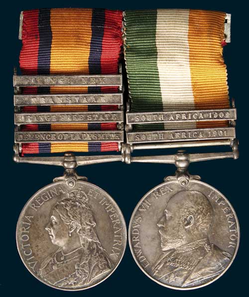 PAIR: Queen's South Africa Medal 1899 (type 2 with ghost dates), - four clasps - Defence of Ladysmith, Orange Free State, Transvaal, Laing's Nek; King's South Africa Medal 1902, - two clasps - South Africa 1901, South Africa 1902. 1681. Sapr. G.Hill. R.E. on both medals. First medal engraved, second medal impressed. Swing mounted, nicely toned, extremely fine.