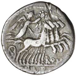C.FABIUS, L.Roscius and Q.Marcius, (118-7 B.C.), silver denarius, (3.74 g), Rome mint, obv. Roma head to right, * behind, rev. Victory in quadriga to right, ROMA below horses. [C] F L R [Q M] in exergue, (S.159 note, B.Fabia 13, Cr.283/1b, Syd.541b). Good fine and a rare variant.