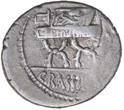 This coin was struck by Crassipes as curule aedile, most likely to fund an extraordinary distribution of corn largesse. The head of the city on the obverse recalls his urban duties such as the maintenance of baths, aqueducts and fountains.