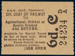 NSW GOVERNMENT TRAMWAYS AND DEPT. of Government Transport, tickets, Circular Quay or Railway to Agricultural, Cricket or Sports Ground and return, consisting of 6d, 1/3 (child), 1/6, 2/6 (pink) and 2/6 (red). Fine - very fine, a rare set. (5)