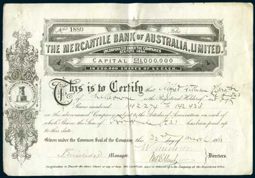 BANKING, The Mercantile Bank of Australia Limited, 18[88], one hundred and fifty shares, black print, scrollwork and company logo left side. With pin holes, folds, some foxing to edges, good fine.