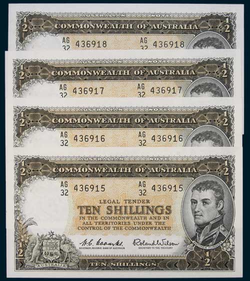 TEN SHILLINGS, Coombs/Wilson (1961), AG/32 436915/8 (R.17), run of four consecutive notes. Uncirculated. (4)