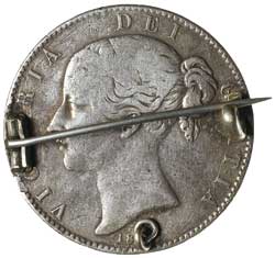 GREAT BRITAIN, Queen Victoria, young head, silver crown, 1845 VIII star stops, brooch mounted on obverse and with loop provision for safety chain, reverse enamelled. Nearly fine/very fine.