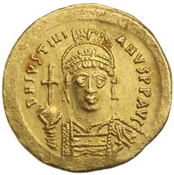 JUSTINIAN I, (527-565), gold solidus, issue of 538-545, Constantinople mint, (4.46 g), obv. helmeted and ...