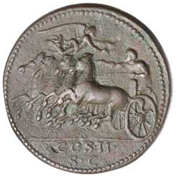 DIDIUS JULIANUS, (A.D. 193), imitative cast medal after original medallion by Giovanni Cavino (44.7 g), obv. laureate bust of emperor draped and cuirassed to right, around IMP CAESAR M DID SEVERVS IVLIAN AVG P P, rev. COS II over SC in exergue, quadriga to left, horses in high action, above Victory flying to right, crowning the charioteer, (Lawrence 67, Klawans 2 [p.99]). Nearly extremely fine and rare.