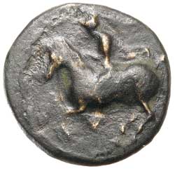 THESSALY, Krannon, (c.350-300 B.C.), AE15, (2.44 g), obv. rider on horse prancing left, **LE* on ground line, all in linear circle, rev. bull butting right, **LE* and trident above, **KRAN* below, (S.2074, SNG Cop 414, BCD Thessaly II 118.15). Toned, very fine, rare with horseman facing left.