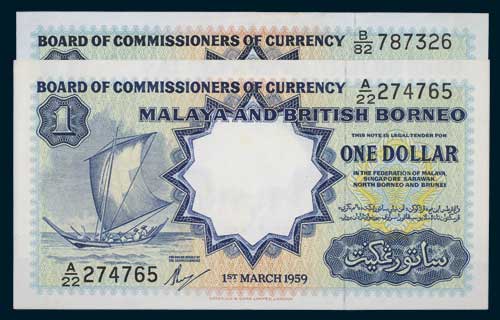 MALAYA AND BRITISH BORNEO, Board of Commissioners of Currency, Elizabeth II, one dollar, 1st March 1959, A/22 274765 and B/82 787326 (P.8A). Centre folds, good extremely fine and scarce. (2)