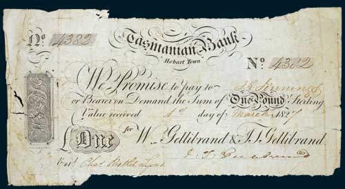 TASMANIAN BANK, one pound, Hobart Town, 1st day of March 1827, No.4832, imprint of Bock, Hobart Town, 'We promise to pay to I.S.Jennings or bearer', signed 'J.T.Gellibrand' for W.Gellibrand & J.T.Gellibrand, entered by 'Chas.Bethel Lyons' (MVR 2). Uneven margins with tears and holes, very good and excessively rare, possibly unique.