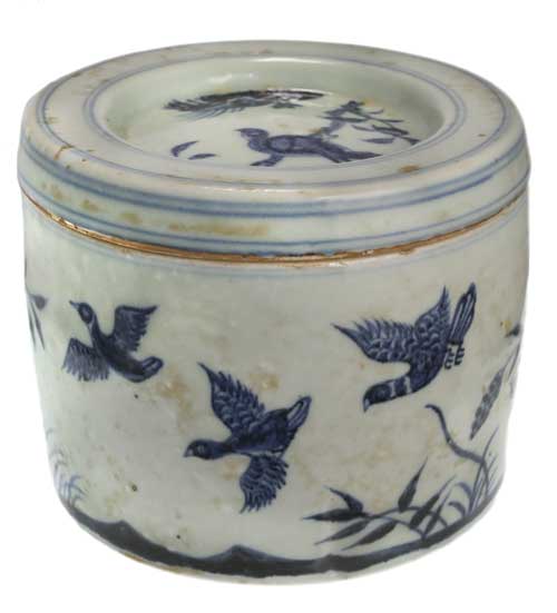 CHINA, (late 19th century - early 20th century), circular lidded pot, of heavy stoneware, blue and white glaze, decorated with birds in a sylvan scene, signed to base of lid and pot, (130mm wide x 110mm high). Very fine.