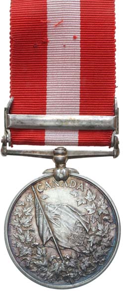 CANADA GENERAL SERVICE MEDAL 1866-70, - clasp - Fenian Raid 1870. Private. J.B.L'Ouiselle 65th. Batt. Impressed. Tone spots, otherwise good very fine.