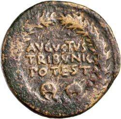 AUGUSTUS, (27 B.C. - A.D. 14), AE dupondius, Rome mint, issued 17 B.C. by M. Sanquinius, (11.10 g), obv. AVGVSTVS / TRIBVNIC / POTEST in three lines within oak wreath, rev. M SANQVINIVS Q F III VIR A A A F F around large SC, (S.1666, RIC 342, C.521, CBN 287, BMC 193). Light brown patina, slightly off centred reverse, good fine and very scarce.