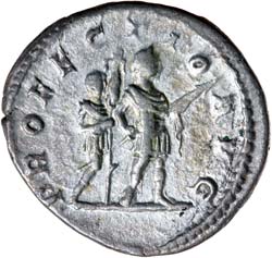 CARACALLA, (A.D. 198-217), silver denarius, issued 213, Rome mint, (2.63 g), obv. laureate head to right of Caracalla, around ANTONINVS PIVS AVG BRIT, rev. Caracalla standing to right in military dress, accompanied by officer (signifer) holding standard, around PROFECTIO AVG, (S.6877, RIC 226, RSC 509). Toned with blue patination, nearly extremely fine/good very fine, scarce.