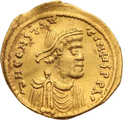 CONSTANS II, (A.D. 641-668), gold semissis, Constantinople Mint, (2.14 g), obv. pearl diademed, draped, cuirassed ...