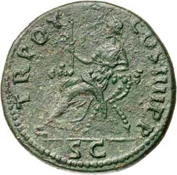 TRAJAN, (A.D. 98-117), AE dupondius, issued 101-102, Rome Mint, (11.31 g), obv. radiate head to right of Trajan, around IMP CAES NERVA TRAIAN AVG GERM P M, rev. Abundantia seated to left on chair of two crossed cornucopiae, holding sceptre, around TR POT COS IIII PP, S C in exergue, (cf.S.3225, RIC 428, C.639). Attractive dark green toning, some surface pitting on reverse, good very fine and scarce in this condition.