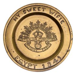 AUSTRALIA, WWII trench art crafted brass dish (9.4cm), in the centre is engraved with a Rising Sun badge and around the raised edge is engraved, 'MY SWEET WIFIE/EGYPT 1941'. Very fine.