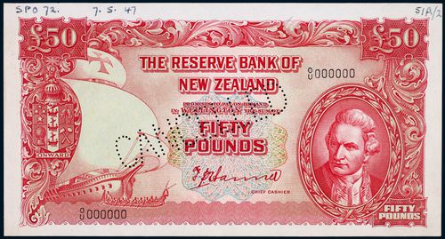 RESERVE BANK OF NEW ZEALAND, T.B. Hanna specimen fifty pounds, 0/U 000000 in Roman numerals style, cancelled in perforated letters diagonally, not stamped specimen, dated 7.5.47. Uncirculated and very rare.