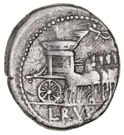 L. RUBRIUS DOSSENUS, (87 B.C.), silver denarius, Rome mint, (3.78 g), obv. Jupiter laureate head to right, sceptre and DOSSEN behind, rev. triumphal chariot to right with small Victory standing on it, L RVBR[I] in exergue, (S.258, Cr.348/1, Syd.705, RSC. Rubria 1). Compact flan, slightly off centred on reverse, very fine and scarce.