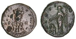 MARCUS AURELIUS, (161-180 A.D.), AE dupondius, Rome Mint, (13.66 g), obv. bearded head right, rev. seated male and female Sarmatian captives flanking trophy, (S.- RIC III 1188) (illustrated); another, (13.95 g), rev. Salus standing left, holding sceptre and feeding serpent rising from altar, (S.5042, RIC 965) (illustrated); others including, rev. winged thunderbolt, (RIC 1219) (2); rev. Aequitas standing standing left, holding scales and cornucopiae, (RIC 1232) (2); rev. Victory walking left, holding wreath and palm, (RIC 1028) (3); rev. Victory standing right, placing a shield inscribed VIC GER in two lines on trunk of palm, (RIC 1031); others. Good fine - good very fine. (19)