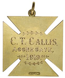 ROSLYN MINIATURE RIFLE CLUB, handcrafted in gold (15ct, 9.2g, 29x29mm), by (beaver) (Beaver & Co., Dunedin), ring top suspension, reverse inscribed 'C.T.Callis/Aggregate/1919'; O.M.R.A. (Otago Miniature Rifle Association) Life Member's badge in silver and gold (30x30mm), by H.W.Huntley (Dunedin), pin-back. Good very fine. (2)
