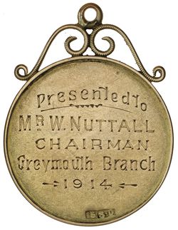N.Z. AMALGAMATED SOCIETY OF RAILWAY SERVANTS, struck in gold (15ct, 7.1g, 26mm), by S.D. (Stewart Dawson & Co), scroll and ring top suspension, reverse inscribed 'Presented to/Mr W.Nuttall/Chairman/Greymouth Branch/1914'. Very fine.