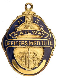 N.Z. RAILWAY OFFICERS INSTITUTE, fob medal, struck in gold (9ct, 7.4g, 37x28mm) and blue enamel, ...