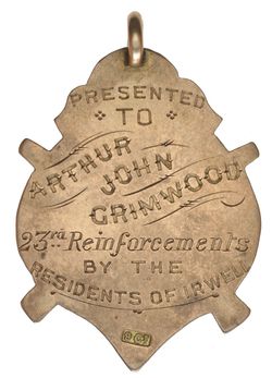 IRWELL, fob medal, handcrafted in gold (9ct, 6.6g, 35x25mm), no maker, ring top suspension, reverse inscribed 'Presented/To/Arthur John Grimwood/23rd Reinforcements/By The/Residents of Irwell'. Very fine.