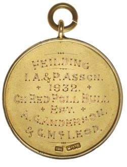 N.Z.A & P. Associations Of The N.I. (N.Z. Agricultural & Pastoral Associations of the North Island), The Conference Of, fob medal, uniface, struck in gold (15ct, 15.15g, 30mm), by M&K (Mayer & Kean, Wellington), ring top suspension, reverse inscribed 'Feilding/I.A.& P.Asscn./1932./Ch Red Poll Bull/Est./A.G.Anderson./& G.McLeod.' Extremely fine.