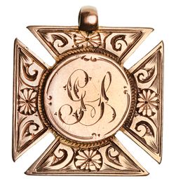 POOLBURN, handcrafted in gold (15ct, 9.64g, 29x36.5mm), no maker, ring top suspension, obverse inscribed 'MS', ...