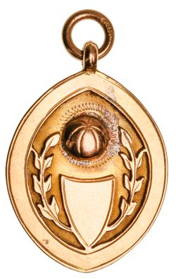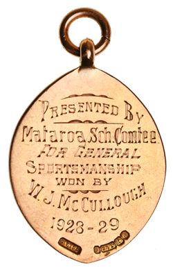 MATAROA, stock fob medal, in gold (9ct, 6.4g, 35x25mm), English maker and hallmark, ring top suspension, reverse inscribed 'Presented By/Mataroa Sch.Comtee/For General/Sportsmanship/Won By/W.J.McCollough/1928-29'. Very fine.