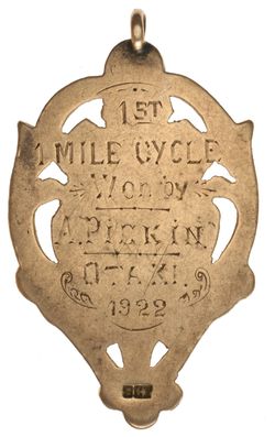 OTAKI (AMATEUR ATHLETIC CLUB SPORTS MEETING), 1922, voided fob hand engraved in gold 9ct, 10.79g, 26x40mm), no maker, ring top suspension, obverse inscribed 'AP', reverse inscribed '1st/1 Mile Cycle/Won by/A.Pickin./Otaki./1922'. Fine.